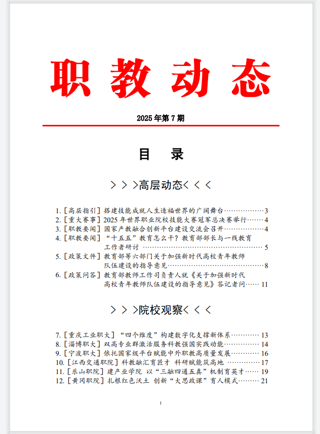 《职教动态》共设《高层动态》《院校观察》《专家视野》《国际瞭望》《孝感之声》五个栏目。《高层动态》主要刊发国家出台的有关职业教育的最新政策文件、教育部对职业教育工作的安排部署和政策文件解读、全国性重要的职业教育会议、全国性重要的职业教育活动等,旨在让读者及时了解相关政策和资讯。《院校观察》主要选登一些有代表性的职业大学、职业学院和中职学校先进的办学理念、好的办学举措和经验,以供各职业学校领导层决策者学习借鉴。《专家视野》精选国内知名专家学者探讨职业教育热点、难点、痛点问题的理论文章,充满真知灼见,能使职教工作者视野变得开阔,思维受到启发。《国际瞭望》主要介绍国际职教发展新趋势、新动态,刊载国际职业教育的重要会议、政策文件、形势研究、改革举措、好的经验等,能使读者打开国际视野,借鉴他国经验。《孝感之声》立足于本市职教改革,积极宣传各职业院校好的办学经验,交流各校办学成果,以便兄弟学校相互学习,共同进步,更有利于孝感职业教育的发展。